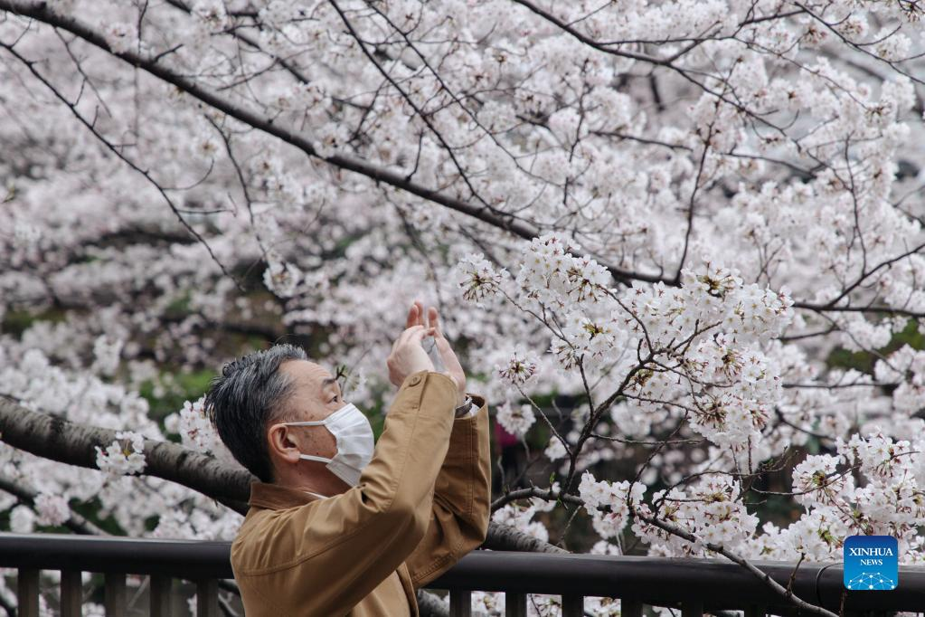 A man takes pictures of cherry blossoms along Meguro River in Tokyo, Japan, on March 27, 2022. (Xinhua/Zhang Xiaoyu)