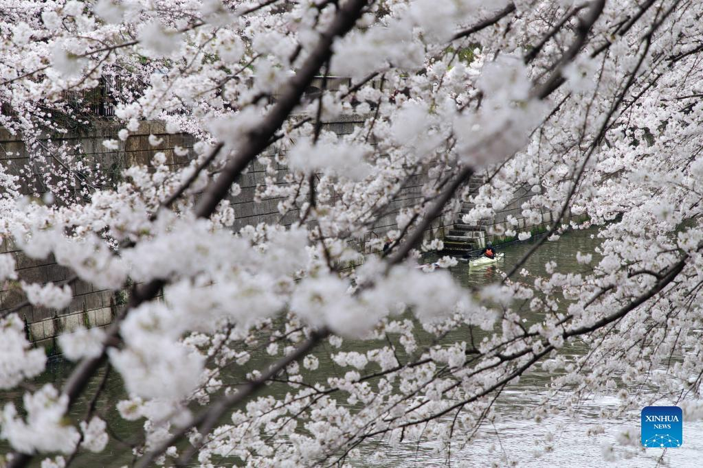 People enjoy the view of cherry blossoms along Chidorigafuchi Moat in Tokyo, Japan, on March 27, 2022. (Xinhua/Zhang Xiaoyu)