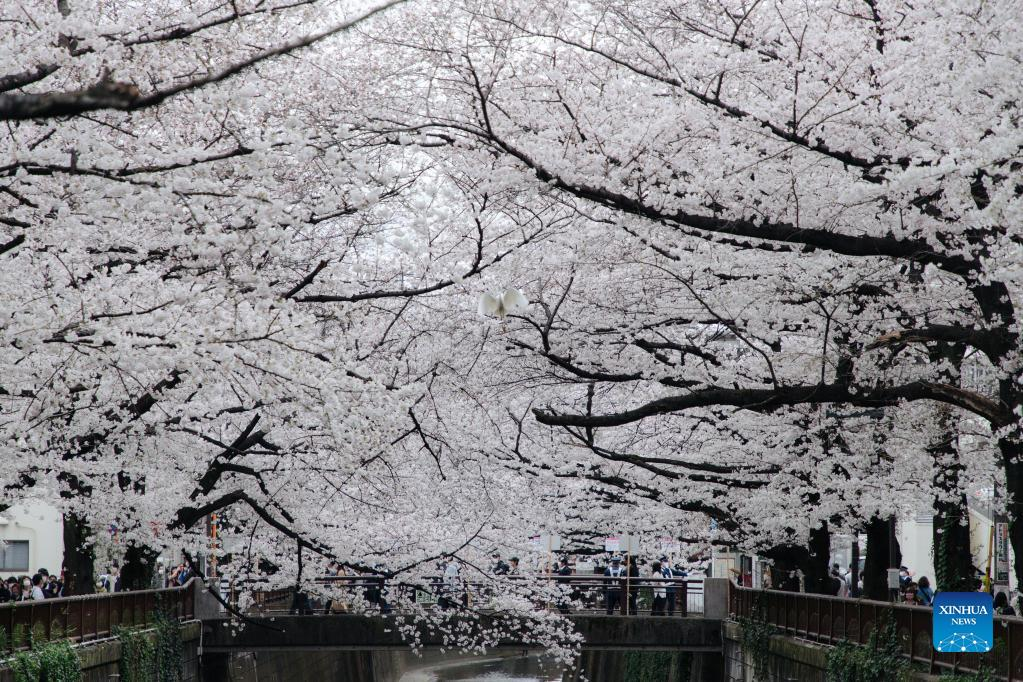 People enjoy the view of cherry blossoms along Meguro River in Tokyo, Japan, on March 27, 2022. (Xinhua/Zhang Xiaoyu)