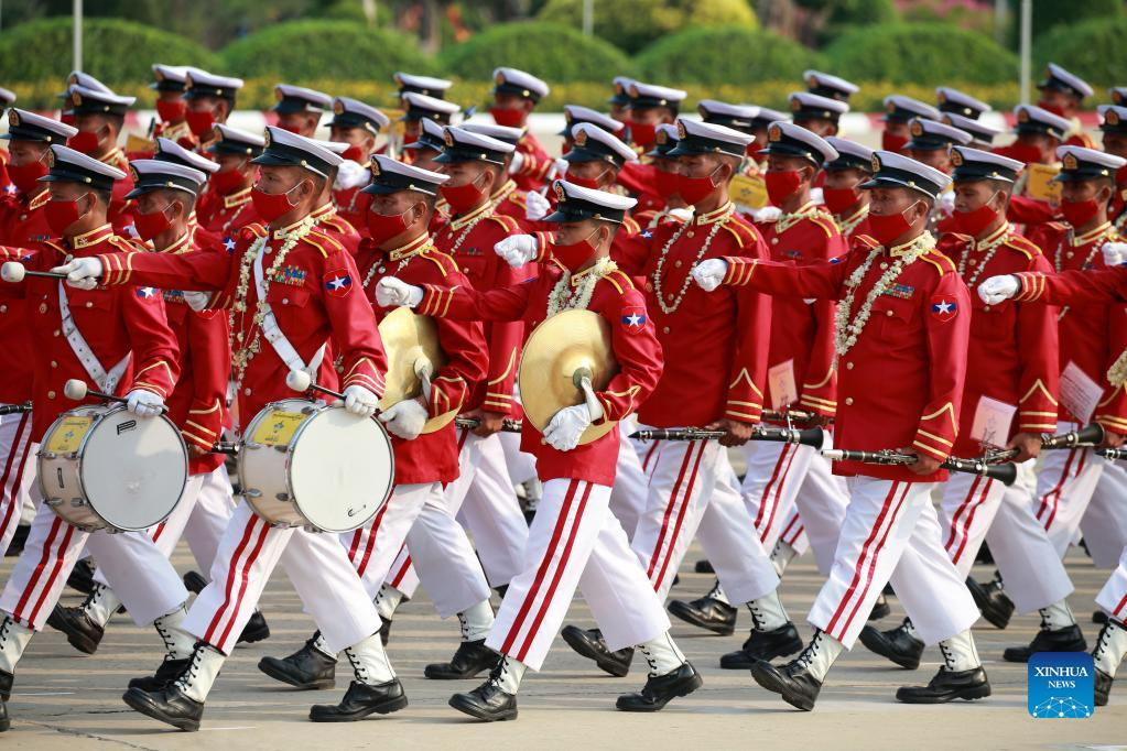 A military band marches in a formation during a military parade to mark the 77th Armed Forces Day in Nay Pyi Taw, capital of Myanmar, March 27, 2022. Myanmar marked the 77th Armed Forces Day with a military parade in the capital city of Nay Pyi Taw on Sunday. (Xinhua/U Aung)