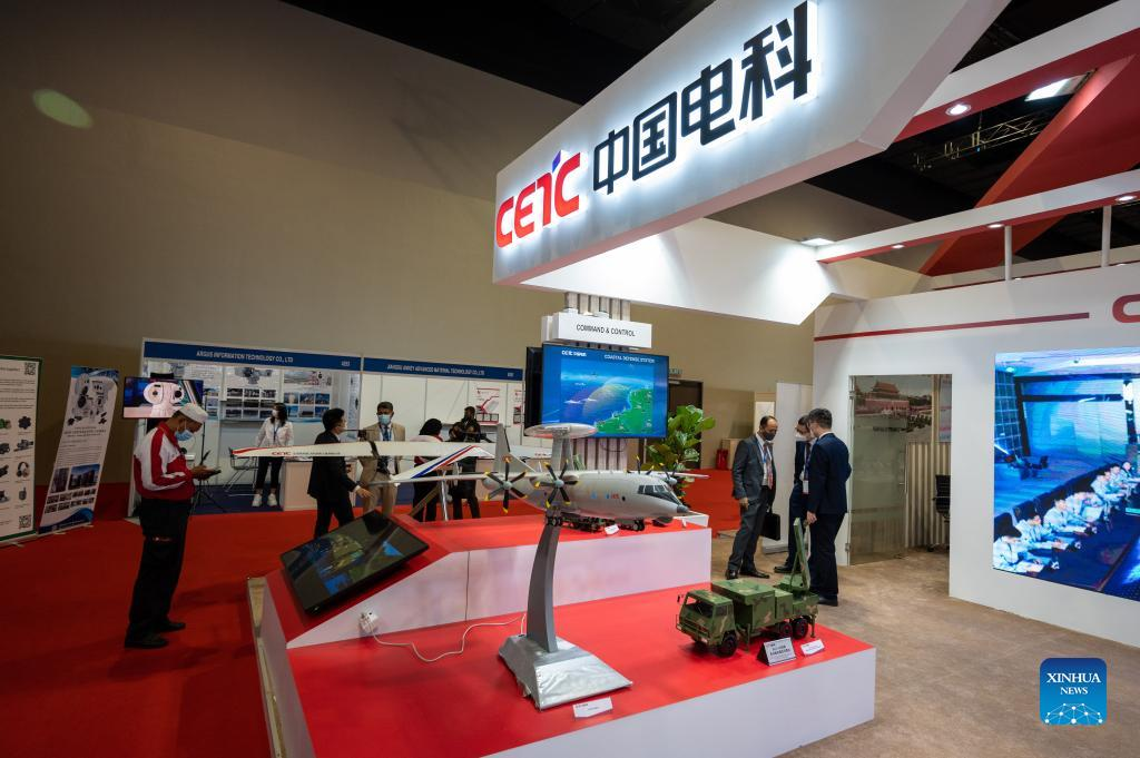 Visitors are seen at the booth of China's CETC International Co., Ltd. at Defense Services Asia 2022 in Kuala Lumpur, Malaysia, March 28, 2022. Defense Services Asia 2022, a biennial defense and weaponry show, opened Monday in the Malaysian capital city Kuala Lumpur. About 1,170 companies will be showcasing their products which include military hardware, electronics, cyber security, border protection, recognition and identification, artificial intelligence, battlefield healthcare, training and simulation systems and police equipment, in 20 country pavilions. Among these are more than 20 Chinese defense companies who are displaying the latest products and solutions in their respective fields. (Xinhua/Zhu Wei)