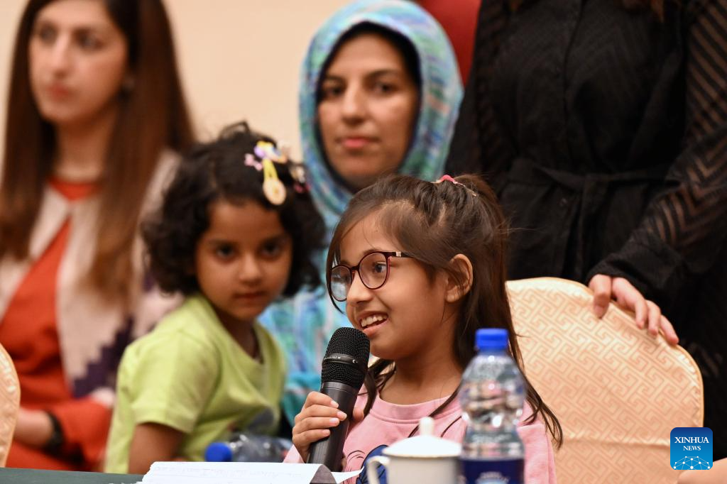 Afrah Amir speaks during an event celebrating the Mid-Autumn Festival at the Chinese Embassy in Pakistan on Oct. 7, 2025. Pakistani children recovering from congenital heart defects and their parents were invited to the Chinese Embassy in Pakistan to celebrate the Mid-Autumn Festival.(Xinhua/Ahmad Kamal)