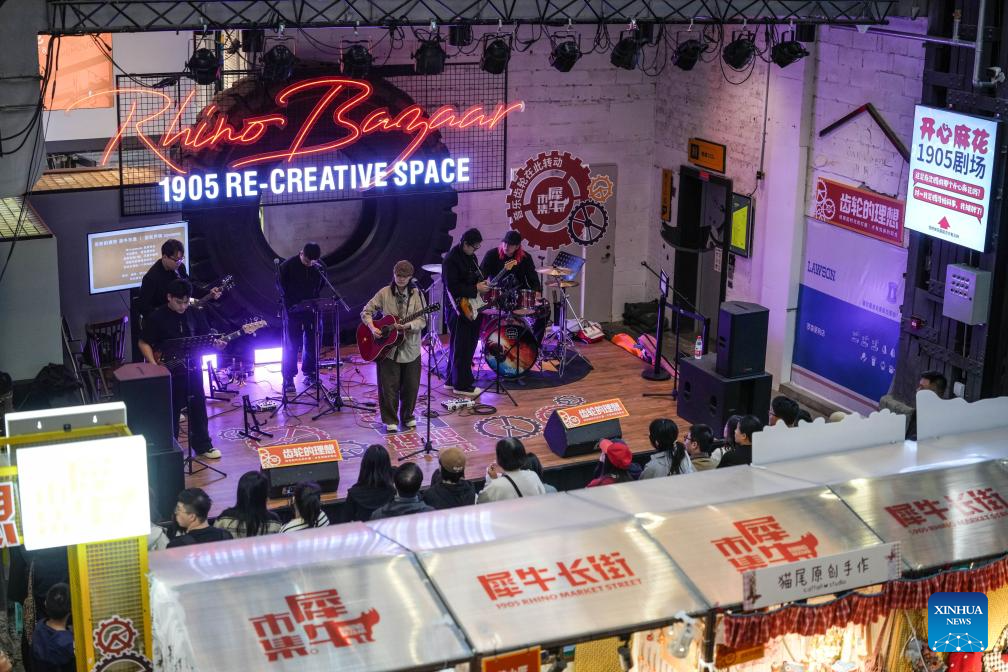 Citizens watch a live show at 1905 Art Re-Creative Space, which is transformed from an abandoned factory, in Shenyang, capital of northeast China's Liaoning Province, Oct. 6, 2025. Many industrial heritages in Shenyang of northeast China's Liaoning Province have been transformed into public leisure spaces, creative industry parks, and distinctive neighborhoods, offering citizens and tourists unique experiences during this year's National Day and Mid-Autumn Festival holiday. (Xinhua/Pan Yulong)