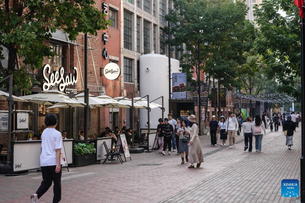 People visit the Hongmei cultural and creative industry park in Shenyang, capital of northeast China's Liaoning Province, Oct. 1, 2025. Many industrial heritages in Shenyang of northeast China's Liaoning Province have been transformed into public leisure spaces, creative industry parks, and distinctive neighborhoods, offering citizens and tourists unique experiences during this year's National Day and Mid-Autumn Festival holiday. (Xinhua/Pan Yulong)