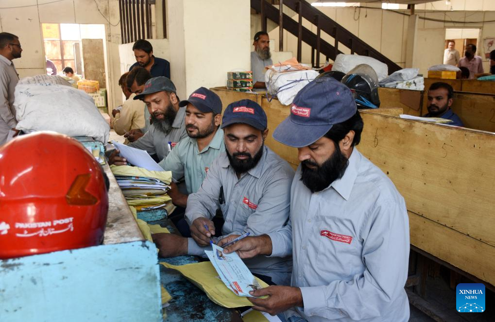 Postmen check posts on World Post Day in Lahore, Pakistan on Oct. 9, 2025. (Photo by Sajjad/Xinhua)