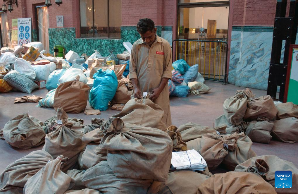 A postman checks a sack of posts on World Post Day in Lahore, Pakistan on Oct. 9, 2025. (Photo by Sajjad/Xinhua)