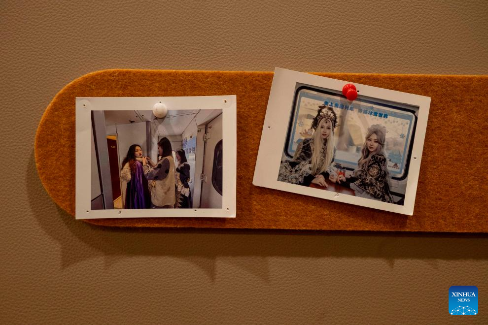 This photo taken on Jan. 25, 2026 shows travel photos taken in 2025 displayed on the Train Y783 in northeast China's Heilongjiang Province. Train Y783, a themed tourism train bound for Yabuli featuring travel photography services, was inaugurated Sunday in Harbin. It marks the company's first offering of its kind this year. Operated by China Railway Harbin Group Co., Ltd., the train allows passengers to dress in diverse costumes and avail themselves of photography services. (Xinhua/Zhang Tao)