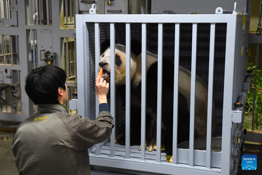 A staff member feeds giant panda Lei Lei ahead of its departure at the Ueno Zoological Gardens in Tokyo, Japan, Jan. 27, 2026. The last remaining two giant pandas in Japan on Tuesday left Tokyo's Ueno zoo for their return to China, marking the first time that there will be no pandas in Japan in around half a century.