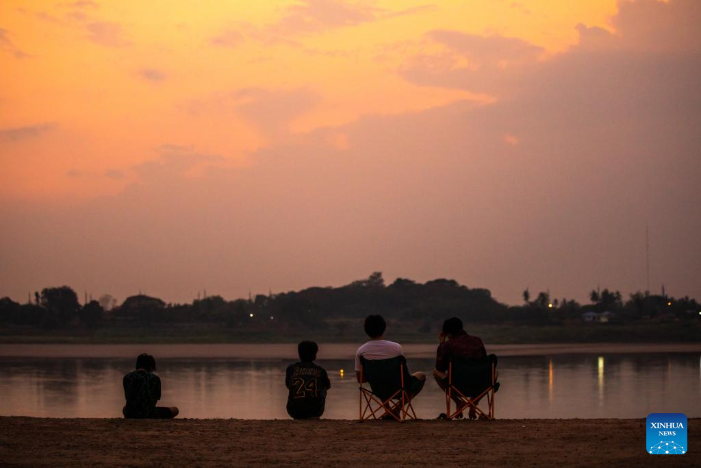 People enjoy sunset along the Mekong River in Vientiane, Laos, March 22, 2026. (Photo by Kaikeo Saiyasane/Xinhua)