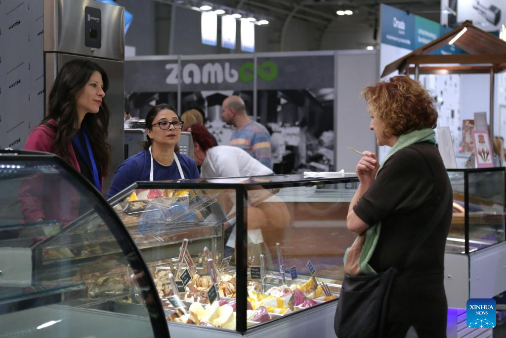 A visitor stands before an ice cream booth at the exhibition in Sofia, Bulgaria, Jan. 27, 2026. The 23rd edition of the international exhibition SIHRE kicked off in the Inter Expo Center here on Tuesday offering products and services for restaurants, hotels, and the catering industry. (Xinhua/Yao Yulin)
