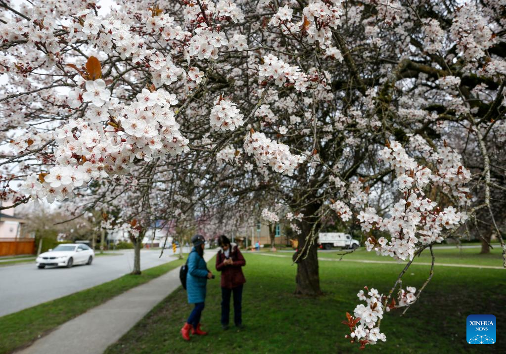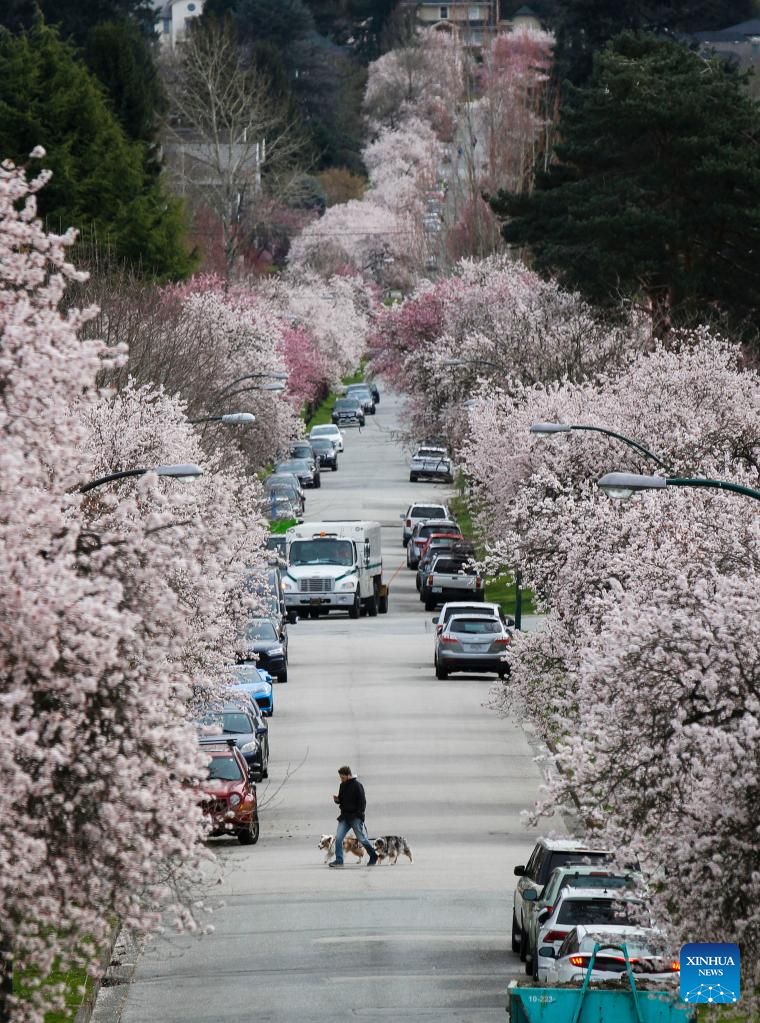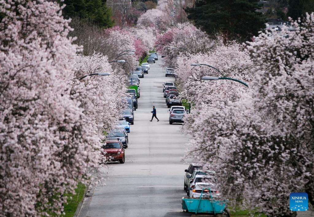 Cherry blossoms are seen along a street in Vancouver, British Columbia, Canada, on March 24, 2022. There are approximately 43,000 cherry trees in Metro Vancouver. (Photo by Liang Sen/Xinhua)