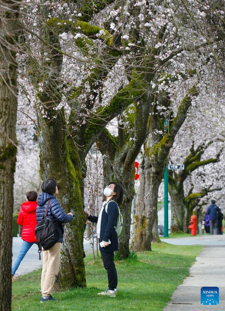 People look at cheery blossoms in Vancouver, British Columbia, Canada, on March 24, 2022. There are approximately 43,000 cherry trees in Metro Vancouver. (Photo by Liang Sen/Xinhua)