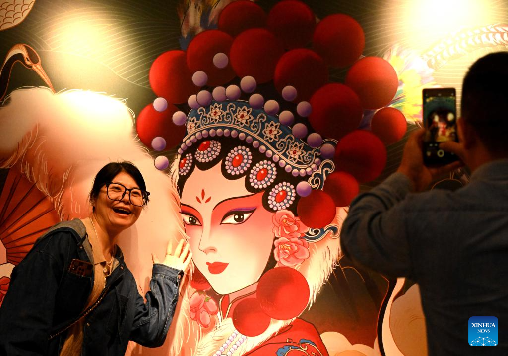 A tourist poses for photos while visiting Hebei Museum in Shijiazhuang, north China's Hebei Province, Oct. 8, 2025. China recorded 888 million domestic tourist trips during the eight-day National Day and Mid-Autumn Festival holiday, up 123 million from the seven-day National Day holiday in 2024, the Ministry of Culture and Tourism said Thursday.