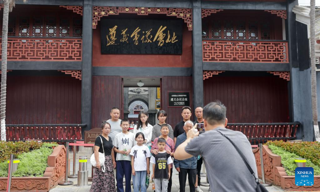 Tourists pose for a group photo at the venue of the Zunyi Meeting in Zunyi, southwest China's Guizhou Province, Oct. 8, 2025. China recorded 888 million domestic tourist trips during the eight-day National Day and Mid-Autumn Festival holiday, up 123 million from the seven-day National Day holiday in 2024, the Ministry of Culture and Tourism said Thursday.