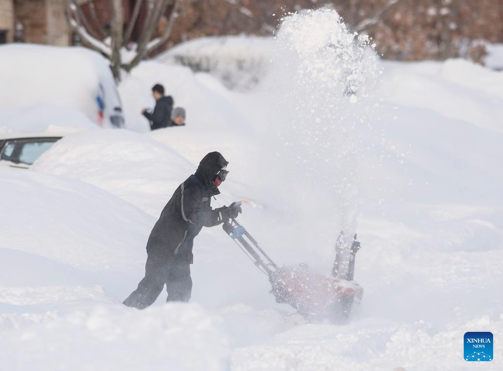 A man clears snow in Oakville, the Greater Toronto Area, Canada, Jan. 26, 2026. (Photo by Zou Zheng/Xinhua)