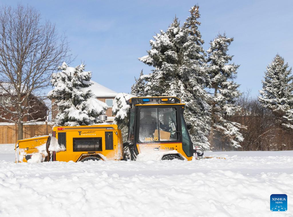 A snowplow clears snow on the sidewalk of a street in Oakville, the Greater Toronto Area, Canada, Jan. 26, 2026. (Photo by Zou Zheng/Xinhua)
