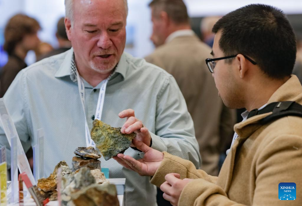 Attendees view mineral rock samples during the Association for Mineral Exploration (AME) Roundup 2026 at the Vancouver Convention Centre in Vancouver, British Columbia, Canada, on Jan. 26, 2026. The AME Roundup 2026 kicked off here on Monday, featuring a four-day exhibition with exhibitors from around the world showcasing products, technologies and services related to mineral exploration and development. The event runs from Jan. 26 to Jan. 29. (Photo by Liang Sen/Xinhua)