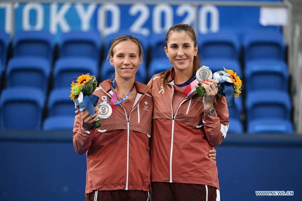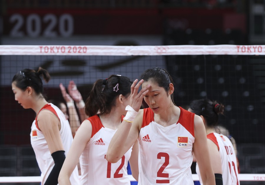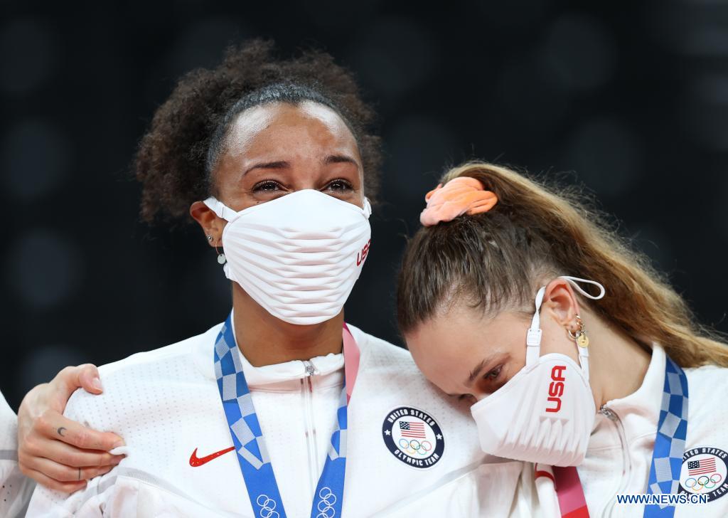 Haleigh Washington (L) of Team USA reacts on the awarding ceremony of the women's volleyball at Tokyo 2020 Olympic Games, in Tokyo, Japan, Aug. 8, 2021. (Xinhua/Ding Ting)