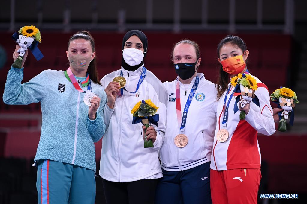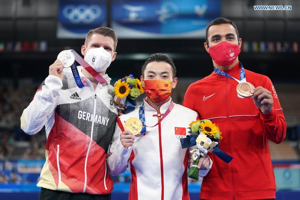 Photo taken on Aug. 1, 2021 shows the awarding ceremony for the women's 3m springboard final of diving at Tokyo 2020 Olympic Games in Tokyo, Japan. (Xinhua/Wang Jingqiang)