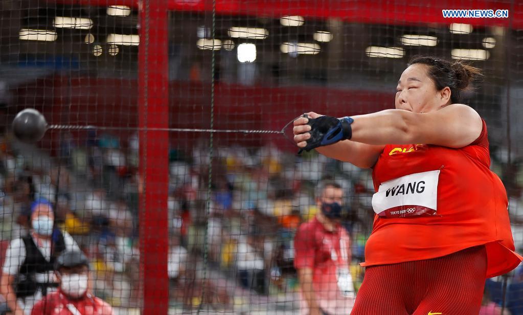 Wang Zheng of China celebrates after the Women's Hammer Throw Final at the Tokyo 2020 Olympic Games in Tokyo, Japan, Aug. 3, 2021. (Xinhua/Wang Lili)