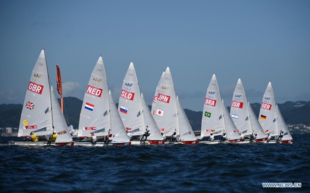 Athletes compete during the sailing men's one person dinghy laser medal race at the Tokyo 2020 Olympic Games in Kanagawa, Japan, Aug. 1, 2021. (Xinhua/Huang Zongzhi)