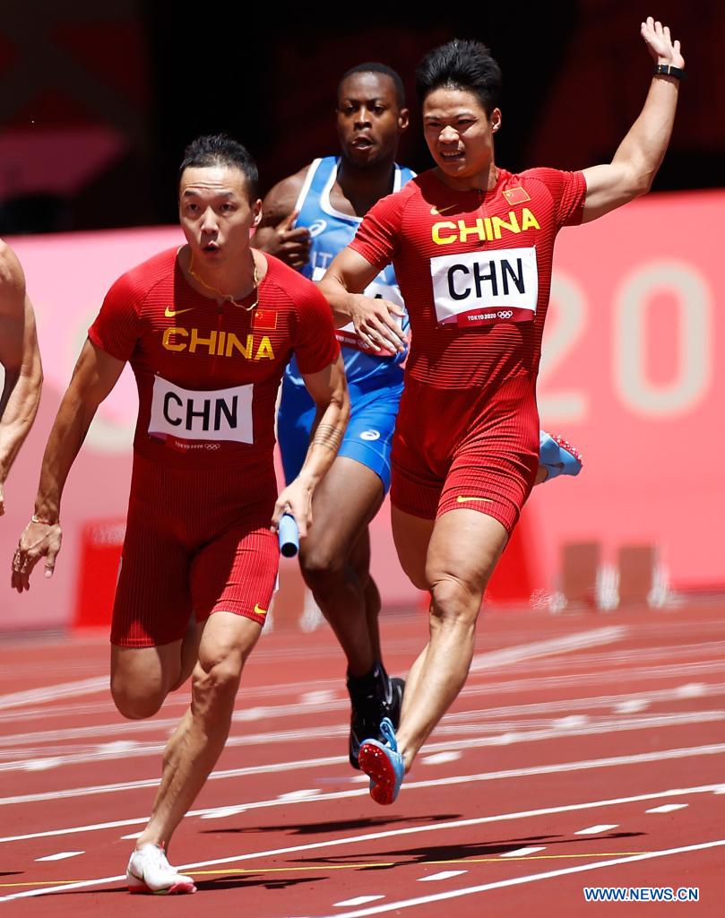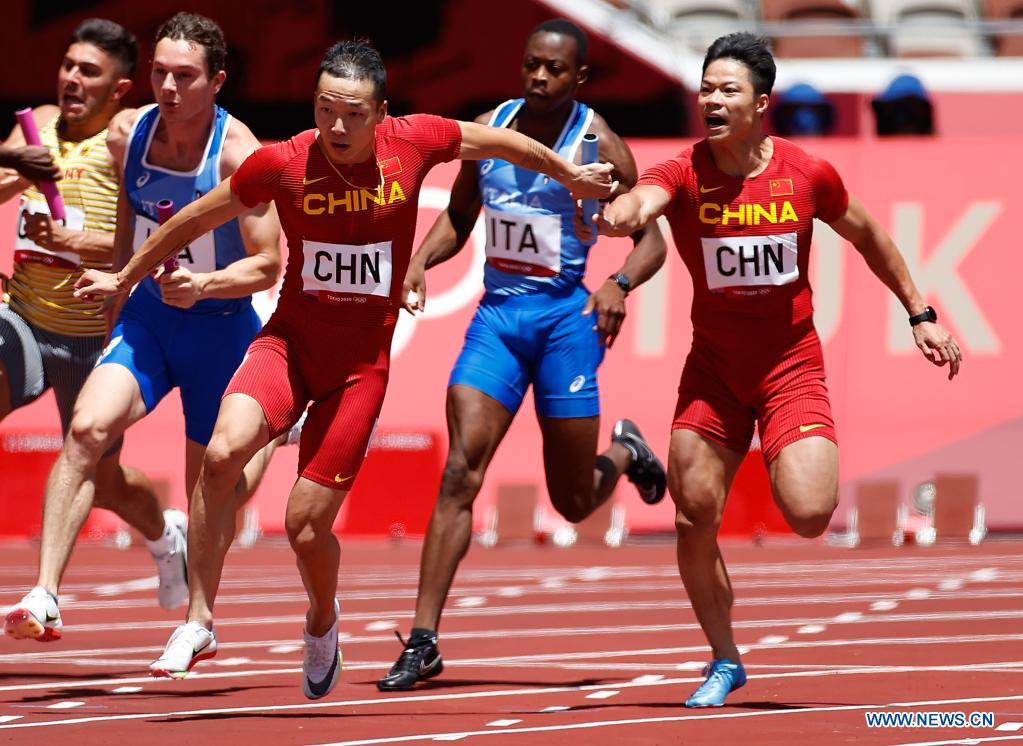 Su Bingtian (1st R) and Wu Zhiqiang (3rd R) of China compete during the Men's 4x100m Heat at the Tokyo 2020 Olympic Games in Tokyo, Japan, Aug. 5, 2021. (Xinhua/Wang Lili)