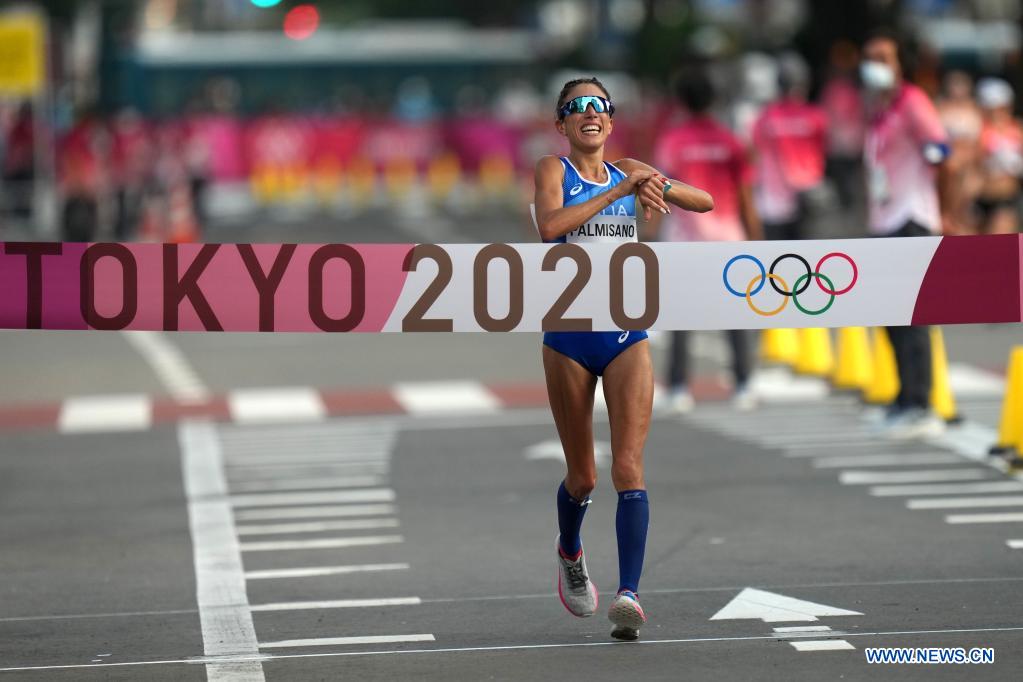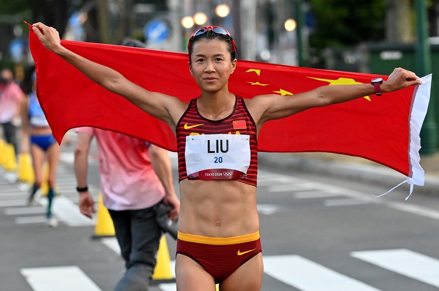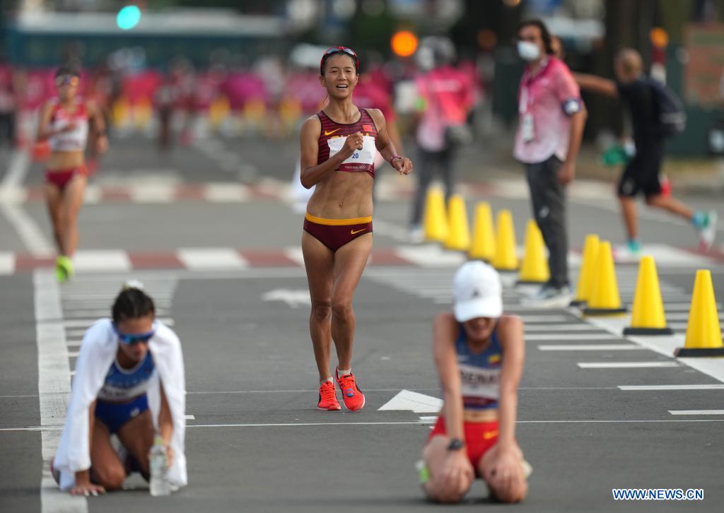 Liu Hong of China celebrates after the women's 20km race walk final at the Tokyo 2020 Olympic Games in Sapporo, Japan, Aug. 6, 2021. (Xinhua/Guo Chen)