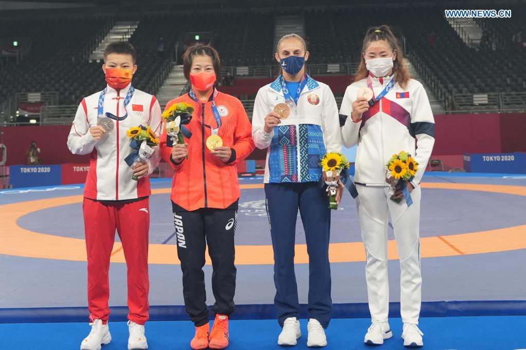 Gong Lijiao of China reacts during the awarding ceremony of the Women's Shot Put at the Tokyo 2020 Olympic Games in Tokyo, Japan, Aug. 1, 2021. (Xinhua/Li Ming)