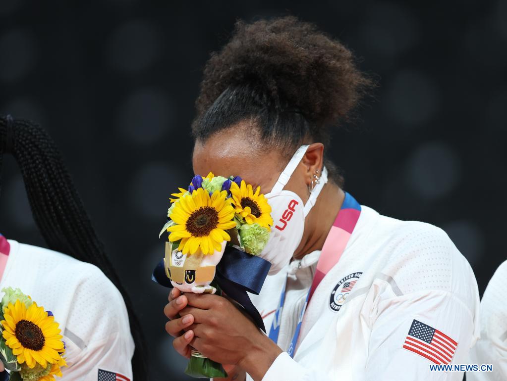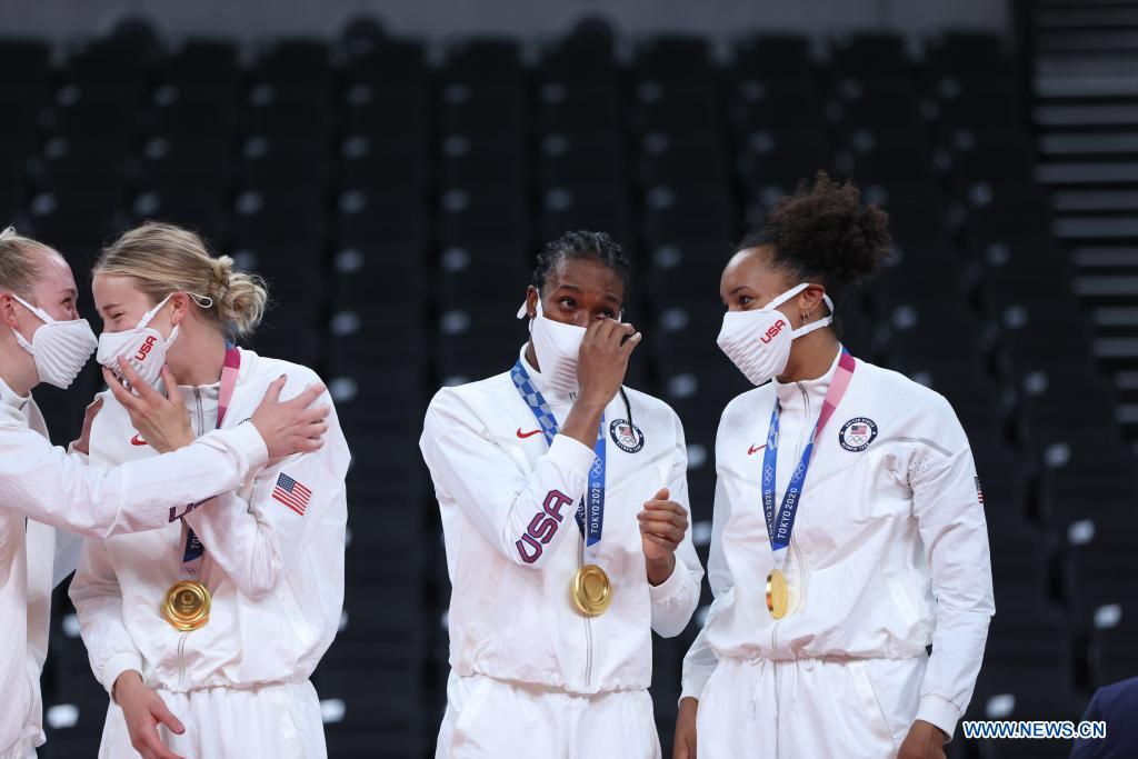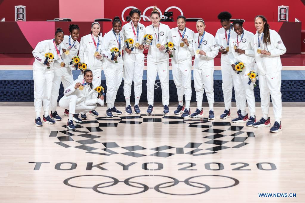 Gold medalists of Team USA pose for a photo on the women's basketball awarding ceremony at Tokyo 2020 Olympic Games, in Tokyo, Japan, Aug. 8, 2021. (Xinhua/Pan Yulong)