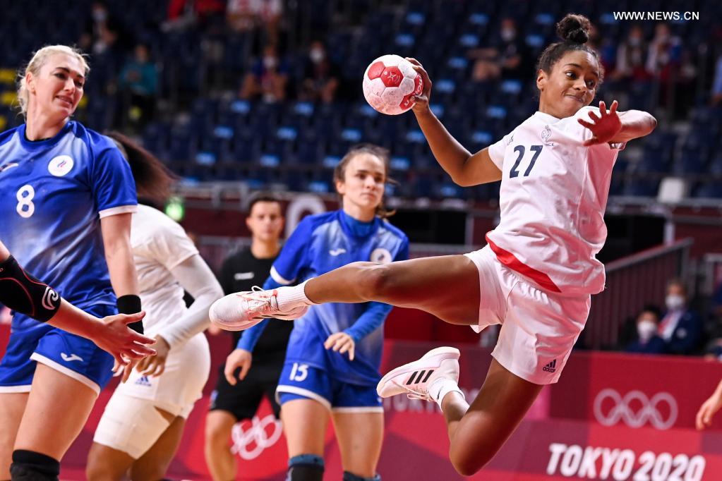 Grace Zaadi Deuna (L front) of France attacks during the women's handball gold medal match between France and ROC at Tokyo 2020 Olympic Games in Tokyo, Japan, Aug 8, 2021. (Xinhua/Du Yu)