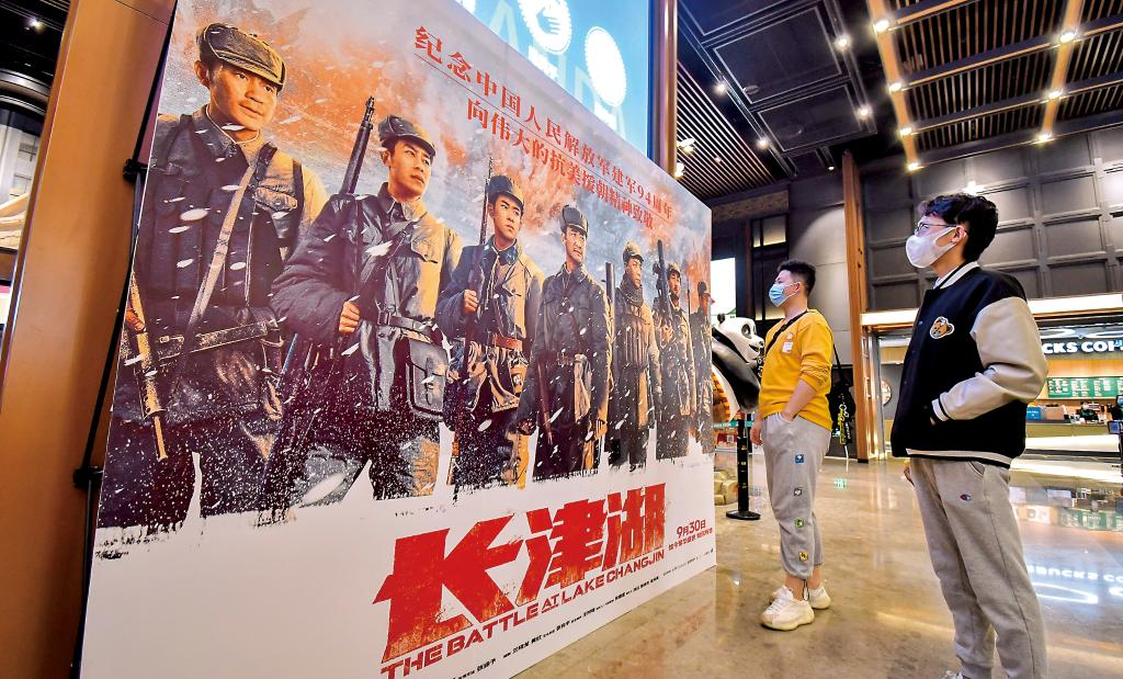 2021年10月7日,两名年轻人在北京一家影院观看电影《长津湖》的海报。新华社记者李欣摄