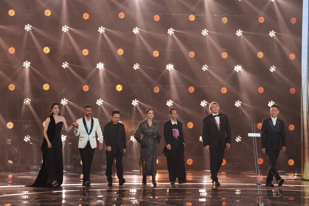 4月16日,第十六届北京国际电影节“天坛奖”国际评委会主席朱丽叶·比诺什(左四)和评委毕赣(左三)、陈英雄(右三)、加布里埃尔·马斯卡罗(左二)、西蒙·弗兰格林(右二)、张小斐(左一)、张译 (右一)在开幕式上。新华社记者 谢晗 摄