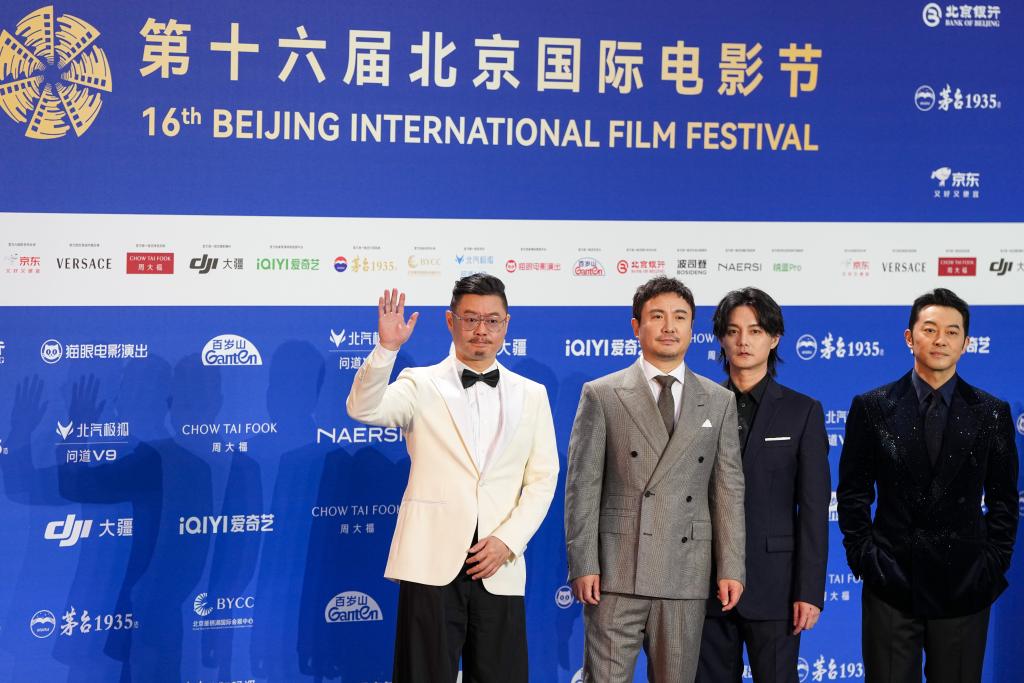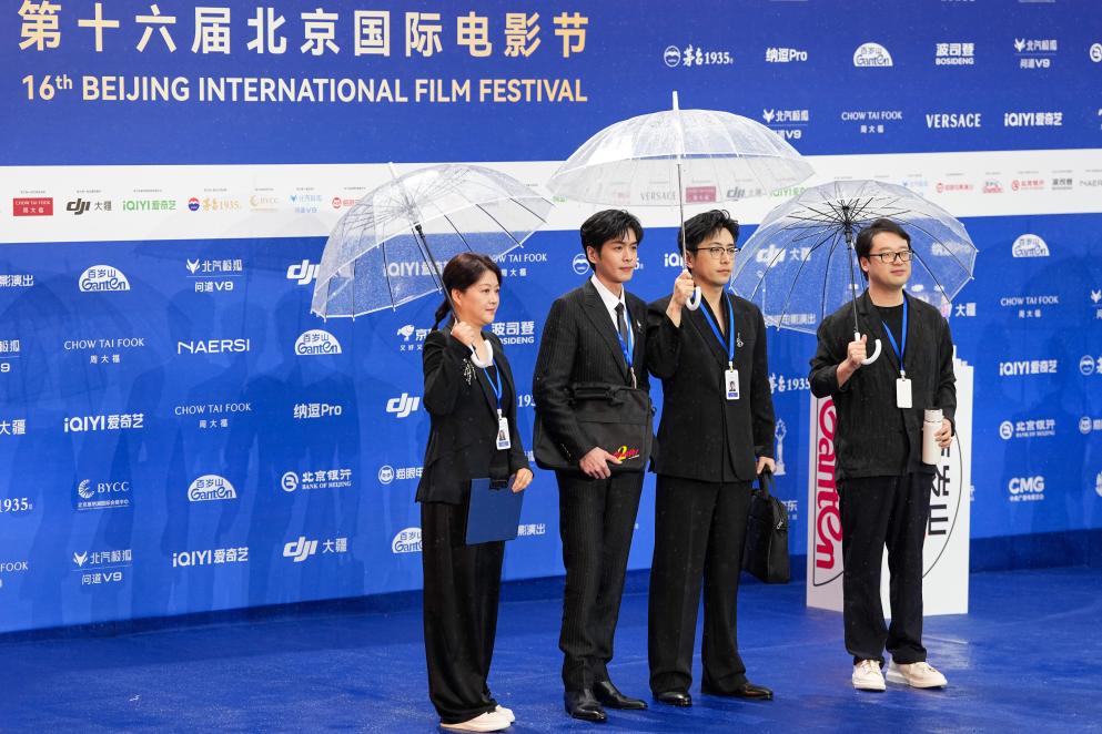 4月16日,电影《年会不能停2》导演董润年(右一)、制片人应萝佳(左一)和演员白客(右二)、张若昀(左二)亮相开幕红毯。新华社记者 鞠焕宗 摄