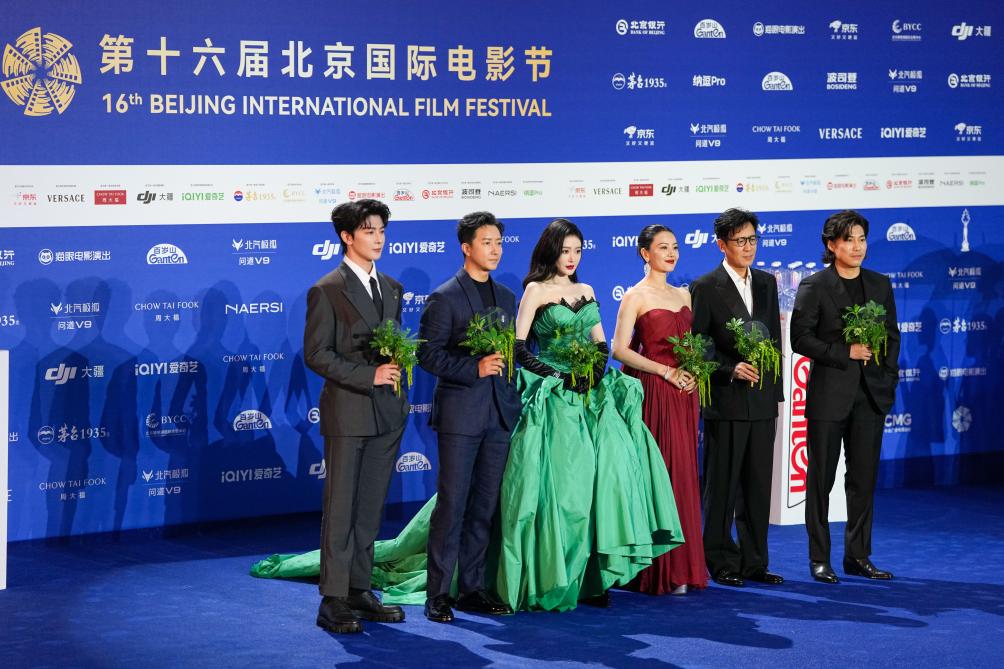 4月16日,第十六届北京国际电影节“天坛奖”国际评委会主席朱丽叶·比诺什(右三)和评委毕赣(中)、陈英雄(右二)、加布里埃尔·马斯卡罗(左二)、西蒙·弗兰格林(左三)、张小斐(右一)、张译 (左一)亮相开幕式红毯。新华社记者 鞠焕宗 摄