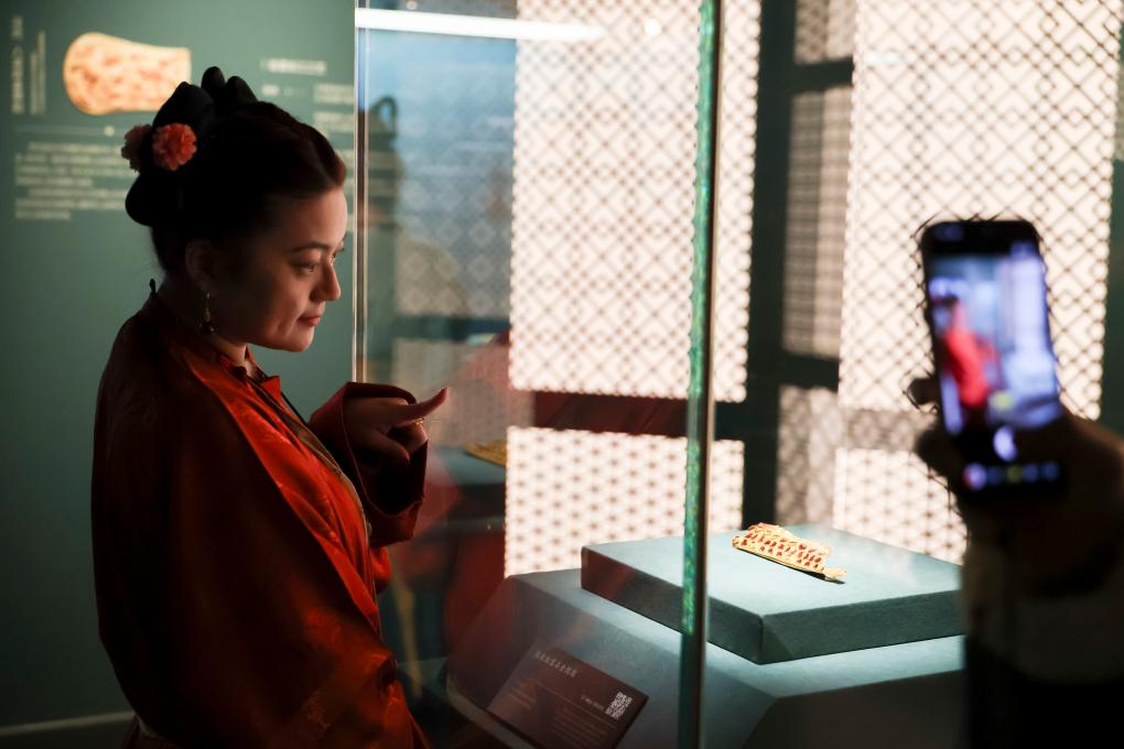 1月20日,观众在公元5至6世纪的镶嵌红宝石金剑鞘展柜前拍照留影。