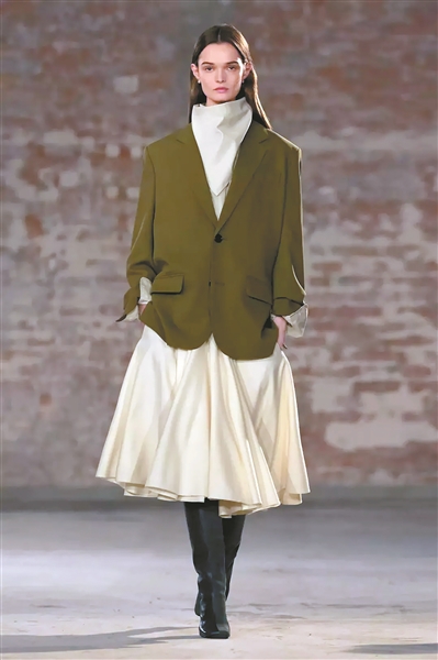 迷笛裙长度在小腿中部,既保持线条修长,又方便配靴。这种长度恰好平衡了实用与造型感,让裙装在寒冷季节依旧保有流动性和女性的柔美。“比如GUCCI秀场上的彩色款,日间可配毛衣与长靴,夜间则搭配西装外套或丝质衬衫。”专业搭配师邓颖建议,秋冬款迷笛半裙多用柔软的褶皱,在温柔与干练之间可通过不同单品的搭配自由切换。