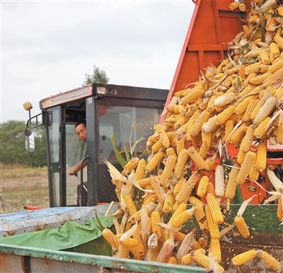 10月7日,在山东省枣庄市市中区孟庄镇焦庄村,农民将收获的玉米装车。