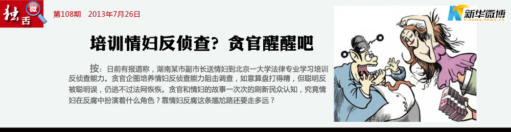 情色反腐百發百中? 隨著二奶們一個個漂亮的迂回穿插,一個個瀟灑的短傳配合,一個個精彩的底線傳中和狡黠老道的反越位戰術,貪官們被射的是丟了官位、丟了金錢。情婦反腐,這是反腐進步了呢,還是腐敗進步了?