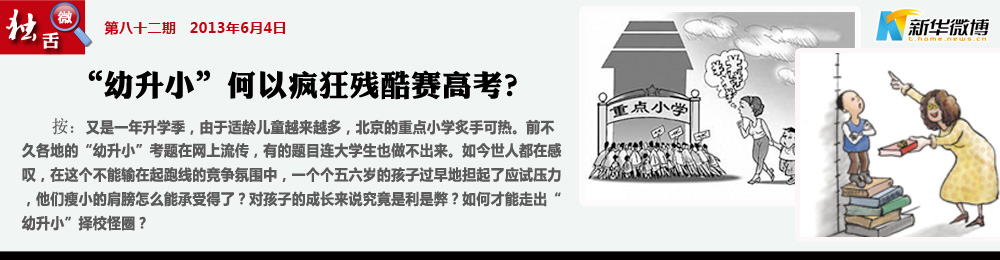 【孩子精神分裂】 A校搞面談,B校考奧數(shù),C校看重才藝,D校要英語(yǔ)會(huì)話,孩子們考前往往要精神分裂好長(zhǎng)一段時(shí)間,學(xué)生進(jìn)一次校門就得背一次考試圣經(jīng)。