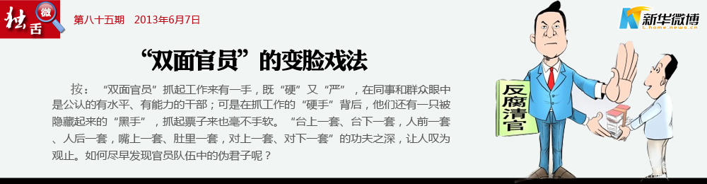 雙面官員實屬高危人群 臺上大唱反腐高調,臺下暗自權力尋租,這種雙面人生過久了,不知道所謂的“反腐清官”們會不會有精神分裂的危險?近年來官員抑郁自殺事件頻發,想來這種精神壓力可能相當不小。從這點來看,雙面官員算得上心理高危人群。體制不改革,此類偽君子就是割掉的韭菜!