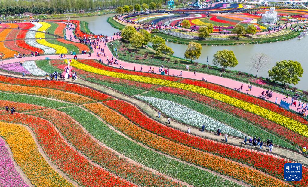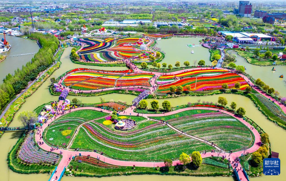 4月13日,游客在江苏省盐城市大丰区荷兰花海景区内赏花游玩(无人机照片)。