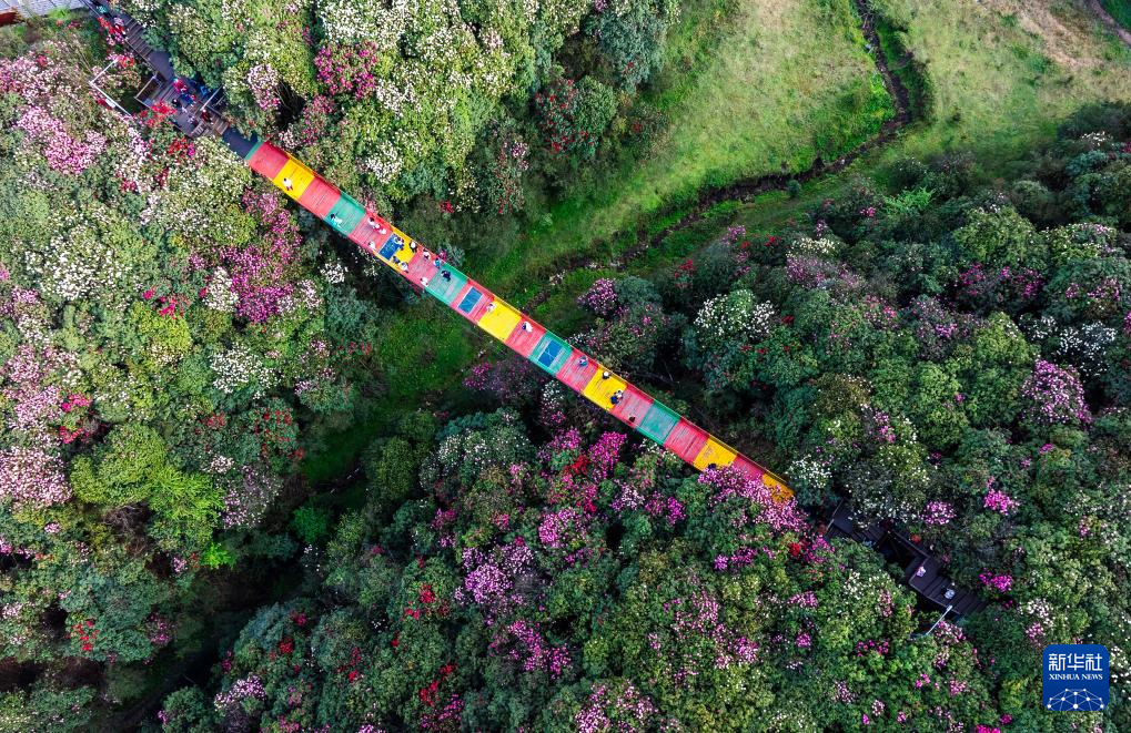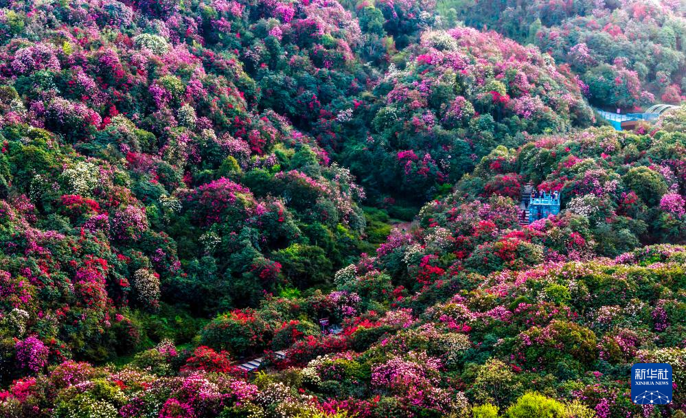4月13日,游客在贵州省毕节市百里杜鹃管理区金坡景区观景赏花(无人机照片)。