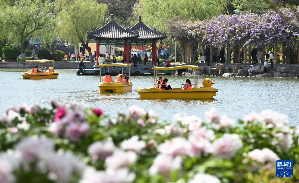 4月13日,游客在山东省滕州市荆河公园内乘船赏花。
