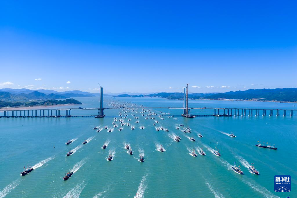 9月16日,渔船驶过浙江省宁波市象山港大桥开赴东海作业(无人机照片)。