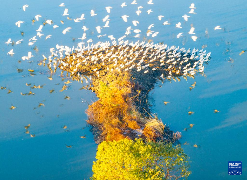 12月6日,群鸟在江苏兴化里下河国家湿地公园内栖息、觅食(无人机照片)。