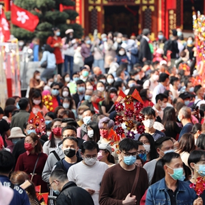 一位市民剛剛從祠內出來,站在門前合影留念。他說,正如“頭炷香”祈福儀式上道長所祈盼,很多市民前來,也是祈求疫情早日消退,百業興旺,國泰民安。“今年人比往年少一些,大家都很配合防疫措施。”入口處的一位工作人員說。