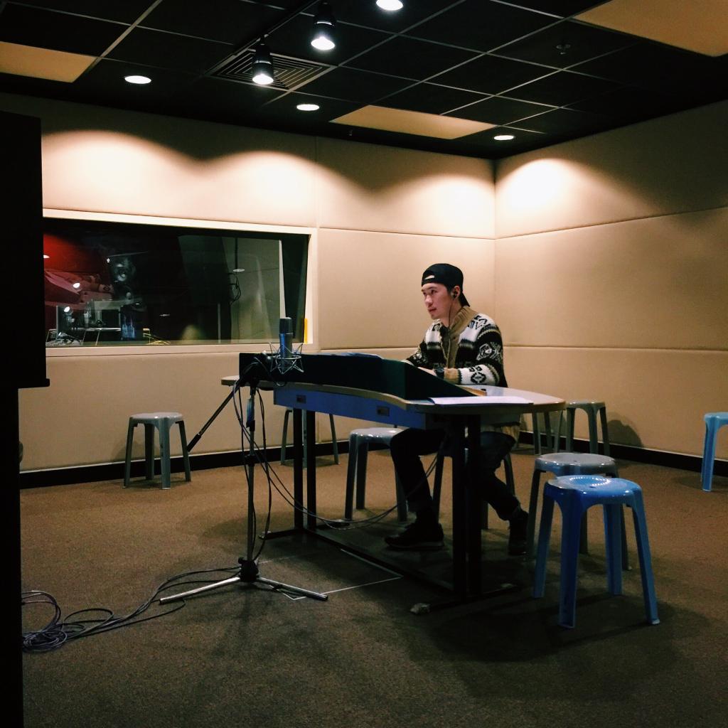 孫中文的工作時間幾乎都是在配音間度過的。(受訪者提供)