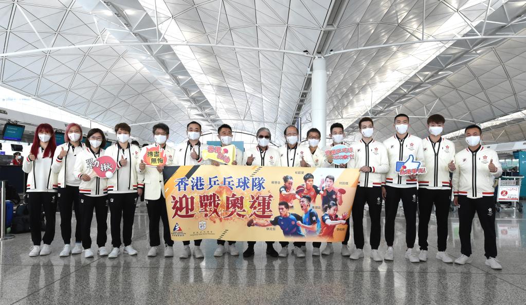 7月17日,中國香港體育協會暨奧林匹克委員會會長霍震霆(中)、中國香港代表團團長貝鈞奇(右七)與中國香港乒乓球隊教練及運動員合影。當日,中國香港代表團從香港國際機場出發參加東京奧運會。據悉,中國香港代表團將有46名運動員參加東京奧運會38個小項的爭奪。新華社記者盧炳輝攝