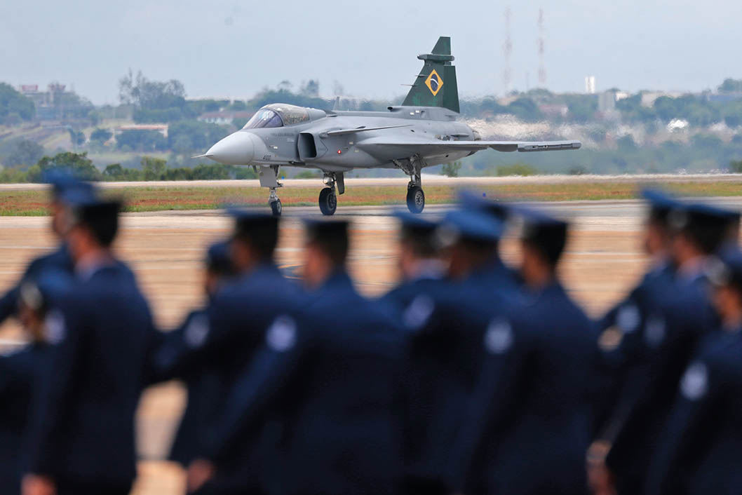 这是2020年10月23日在巴西首都巴西利亚空军基地拍摄的一架F-39“鹰狮”战斗机