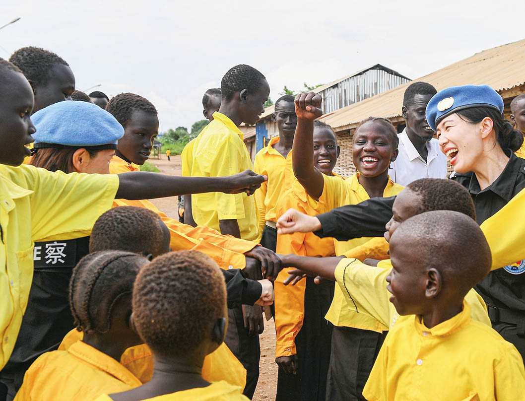 2024年8月19日,在南苏丹首都朱巴,中国第十支赴联合国南苏丹任务区维和警队队员赵欢(右)、高雅丽(左)与难民营学校学生互动